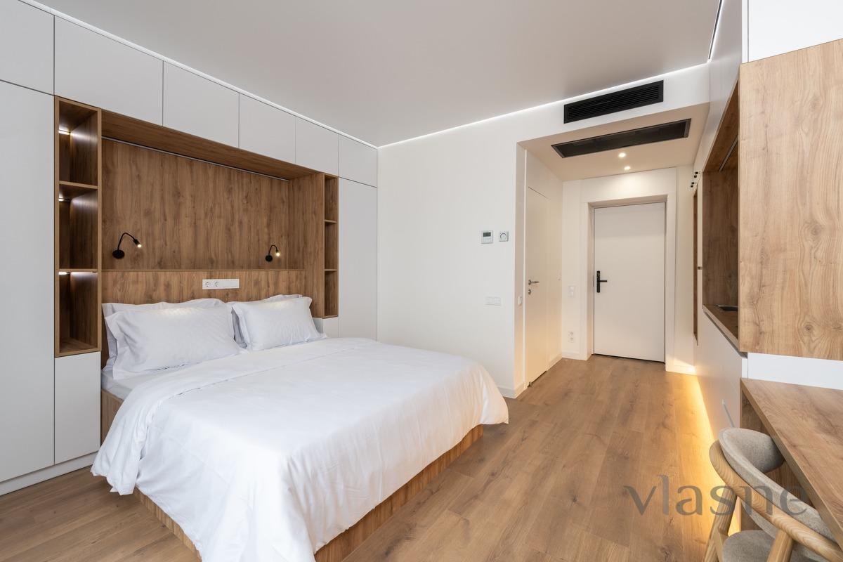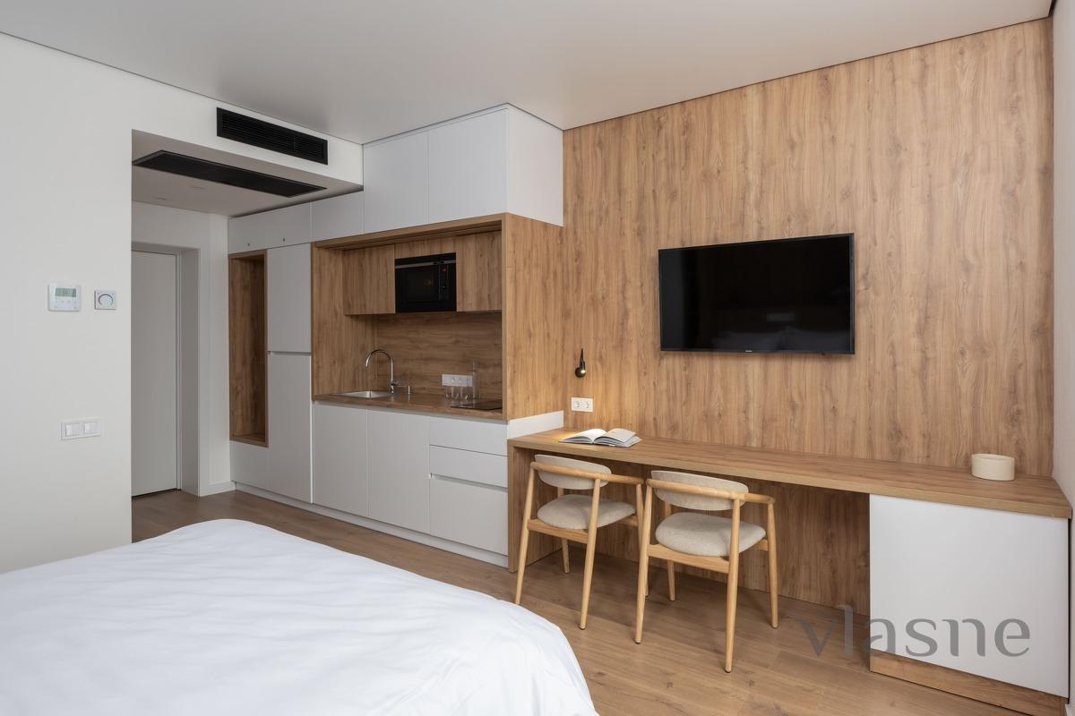 Простір поєднує спальну та кухонну зони. У номері є двоспальне ліжко, робочий стіл, телевізор із пласким екраном, система кондиціонування, підсвітка з можливістю регулювання та зона для зберігання речей. Кухня оснащена всім необхідним: холодильник, мікрохвильова піч, чайник, набір посуду та Kitchenette для приготування сніданку або кави.