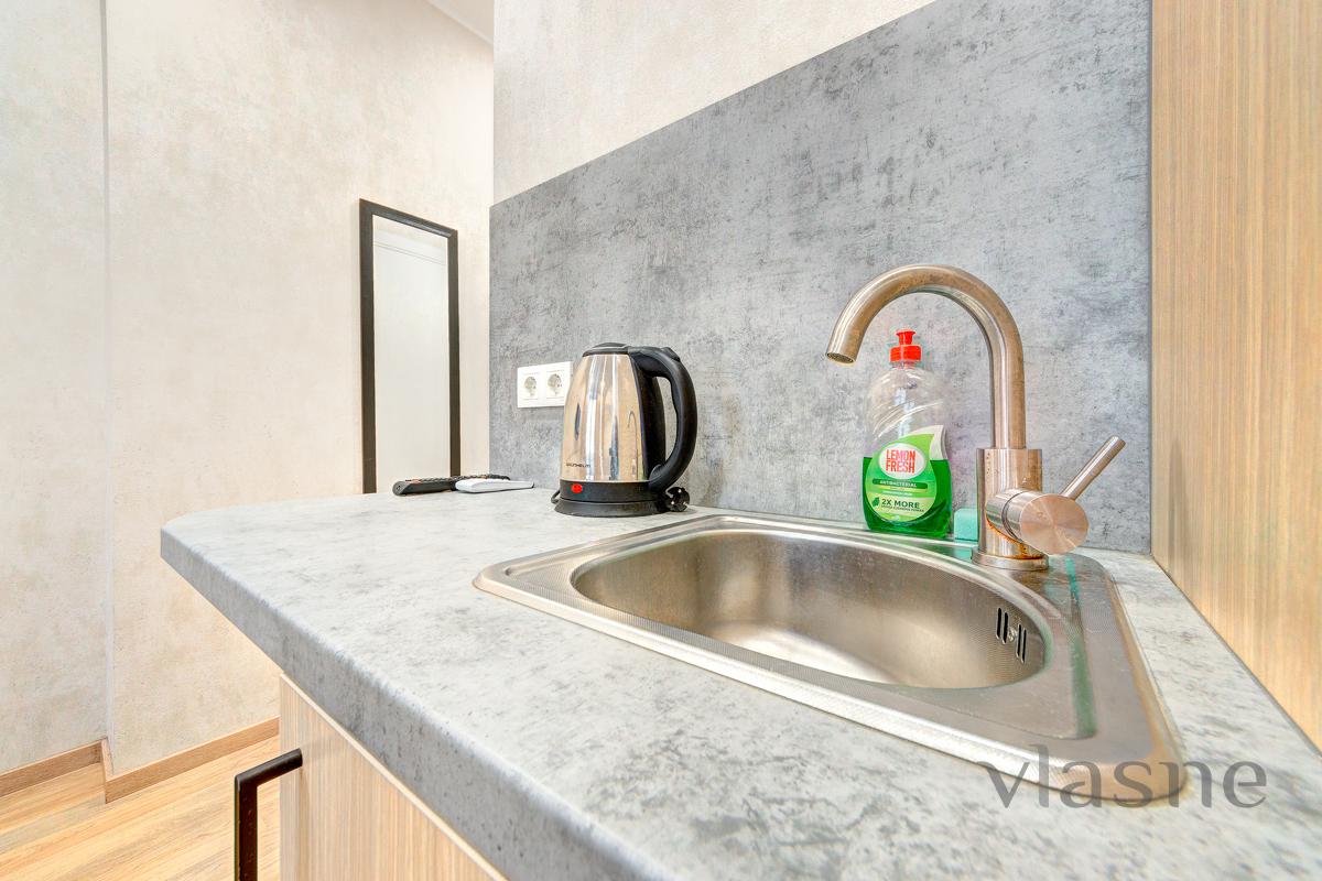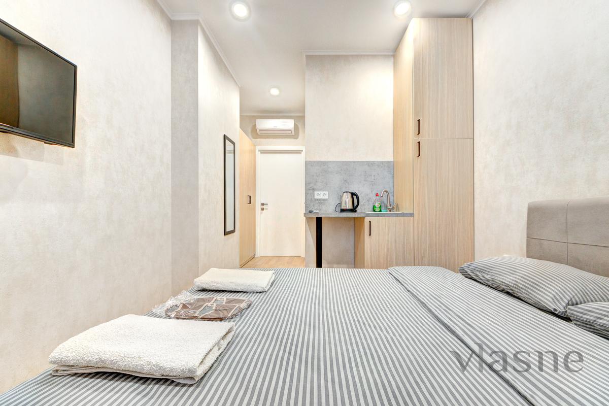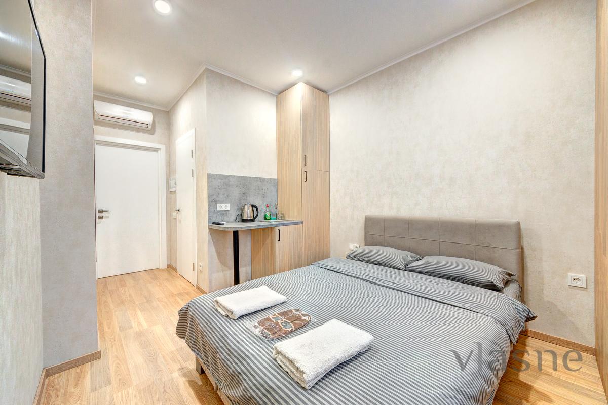 In the middle there is a small kitchen area, which contains a worktop with a sink, a small cabinet, a refrigerator, a kettle, as well as all the necessary utensils and utensils. The apartment has all the necessary furniture for your comfort: a double bed with an orthopedic mattress, a large wardrobe for placing special speeches. For your comfort and welcome, an air conditioner and TV have been installed. The apartment has Wi-Fi installed. The sanitary unit is connected to the shower, in the middle there is a sink and hygiene precautions are the first necessity. You will always get fresh, white clothes and clean towels. For availability of renting an apartment at the weekend, please check the telephone number. For quick reservations, call!