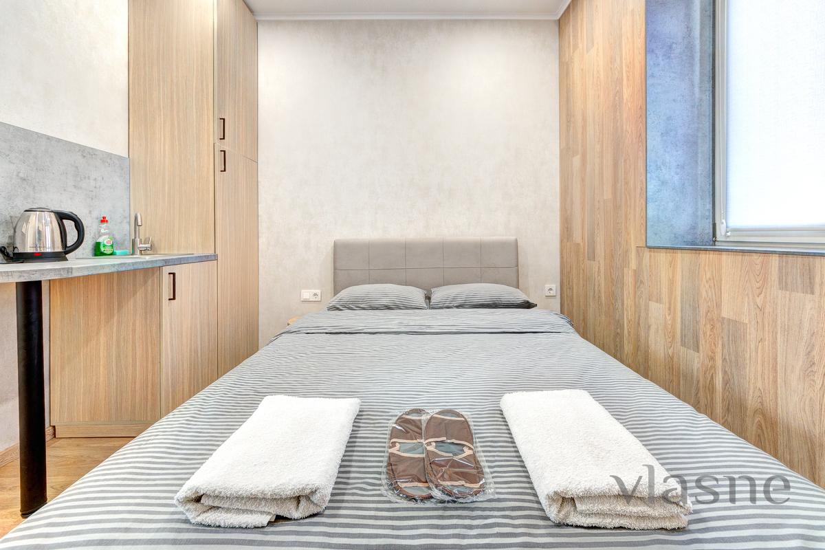 The apartment is located at the address: Beresteysky Avenue, 1, Vokzalna metro station (10 km on foot). Nearby are within walking distance: the shopping center "Ukraine Department Store", restaurants, cafes, cafes, the "Nova Poshta" branch and the "Varus" supermarket. A one-room apartment has been recently renovated, decorated in light colors and with ergonomic furniture.