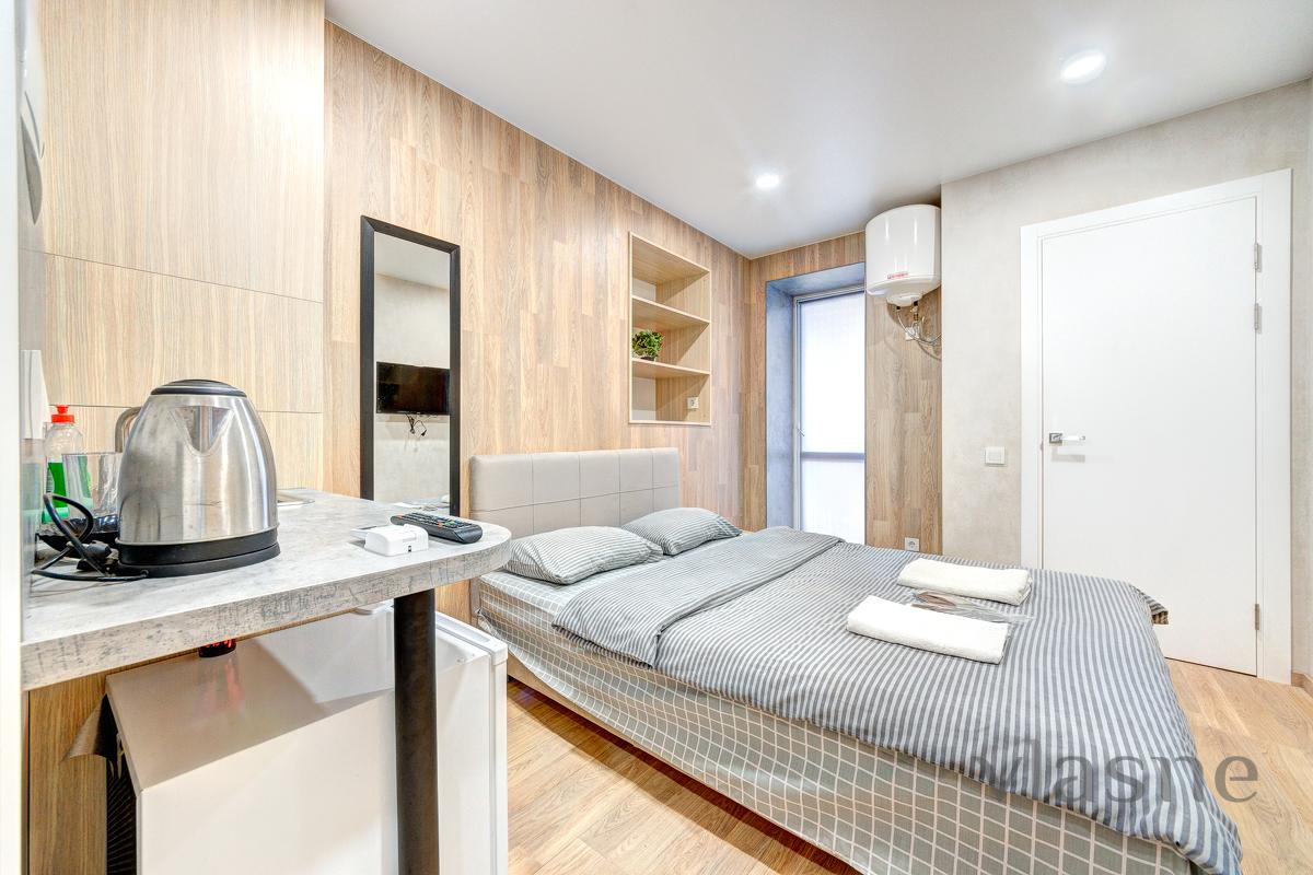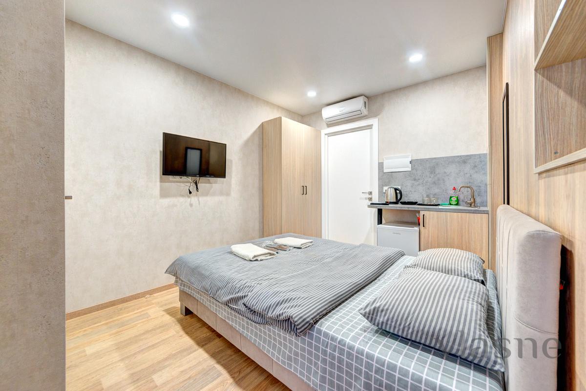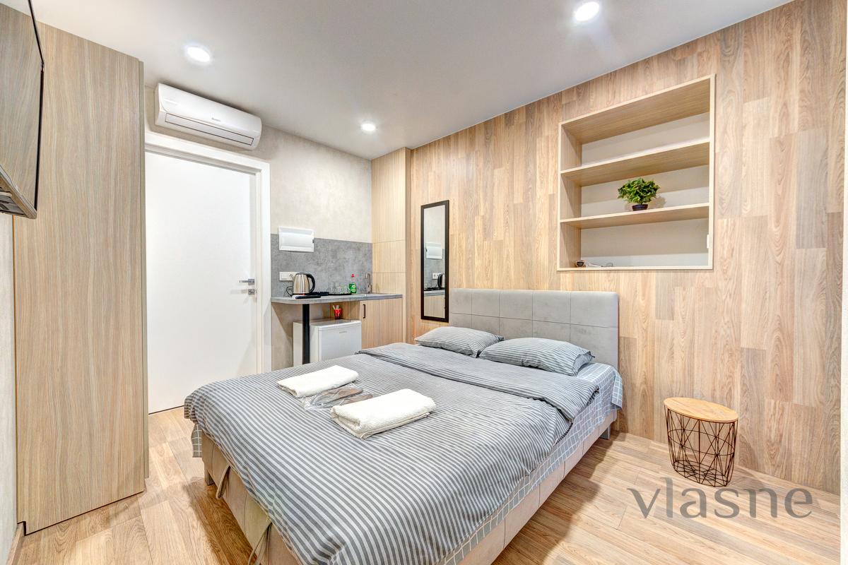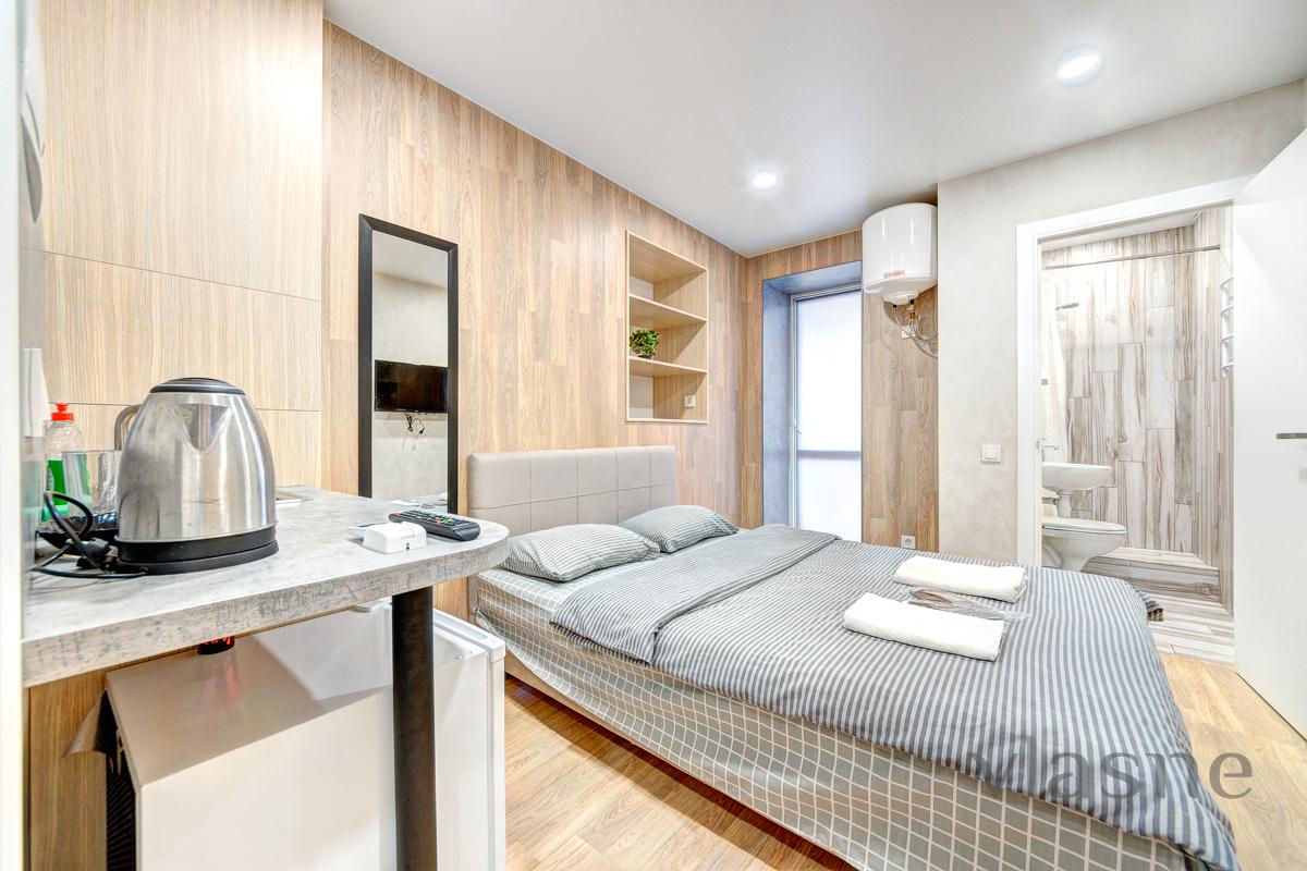 In the middle there is a compact kitchen area, which contains: a worktop with a sink, a small cupboard, a refrigerator, a kettle, and all kitchen utensils. The apartment has all the necessary furniture for your comfortable stay: a double bed with an orthopedic mattress, a bedside table, a large wardrobe for special occasions. For your convenience, an air conditioner and a boiler are provided, and WI-FI and a TV are installed for reception. The sanitary unit is connected to a shower, in the middle there is a sink and hygiene precautions. Obviously, there will always be fresh linen, clean towels and disposable caps. Call at any time