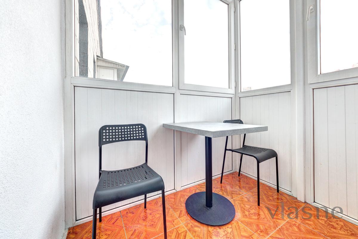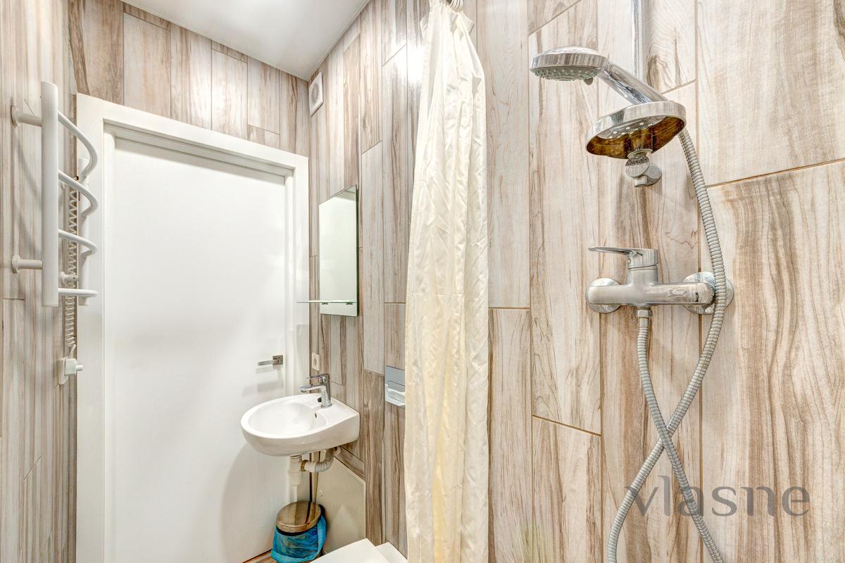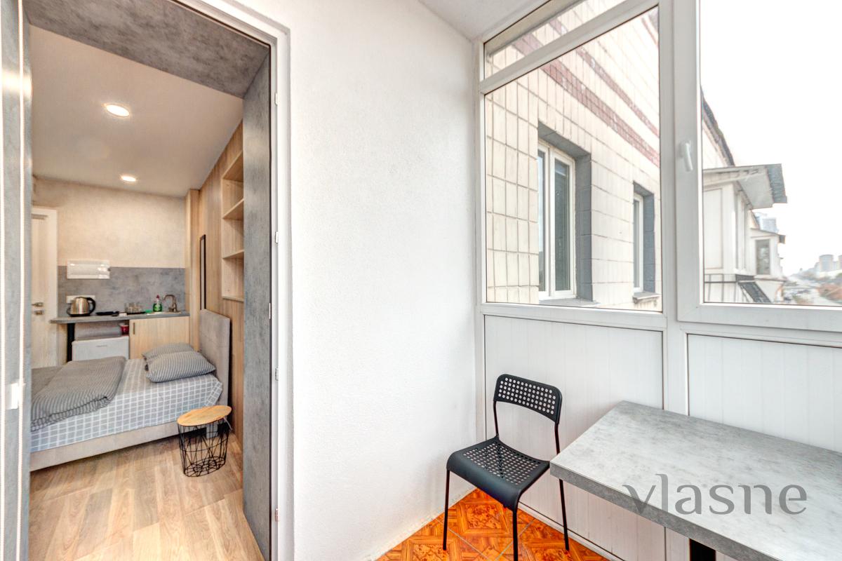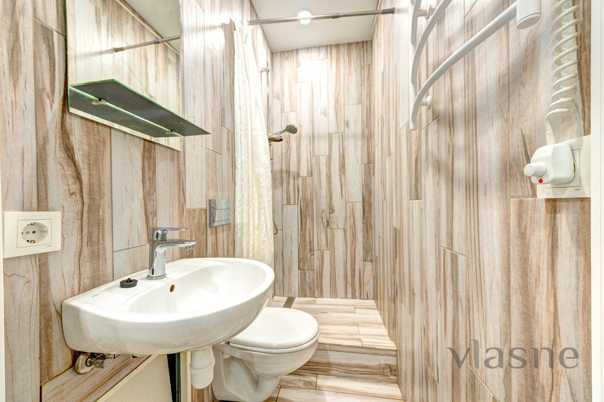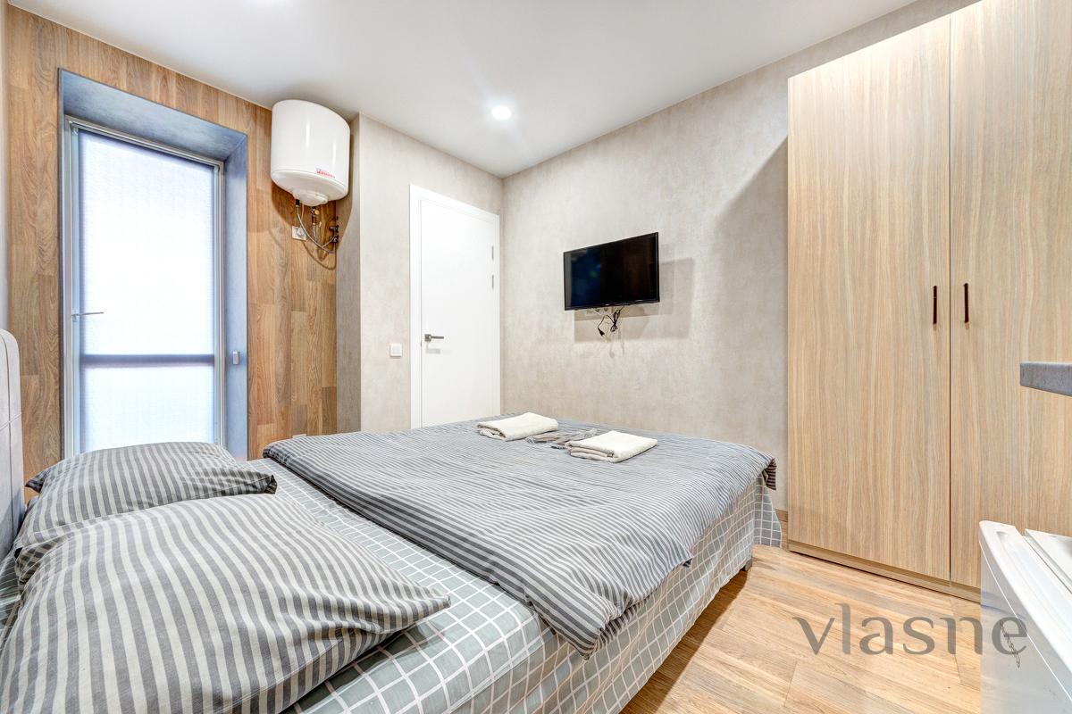 In the middle there is a compact kitchen area, which contains: a worktop with a sink, a small cupboard, a refrigerator, a kettle, and all kitchen utensils. The apartment has all the necessary furniture for your comfortable stay: a double bed with an orthopedic mattress, a bedside table, a large wardrobe for special occasions. For your convenience, an air conditioner and a boiler are provided, and WI-FI and a TV are installed for reception. The sanitary unit is connected to a shower, in the middle there is a sink and hygiene precautions. Obviously, there will always be fresh linen, clean towels and disposable caps. Call at any time