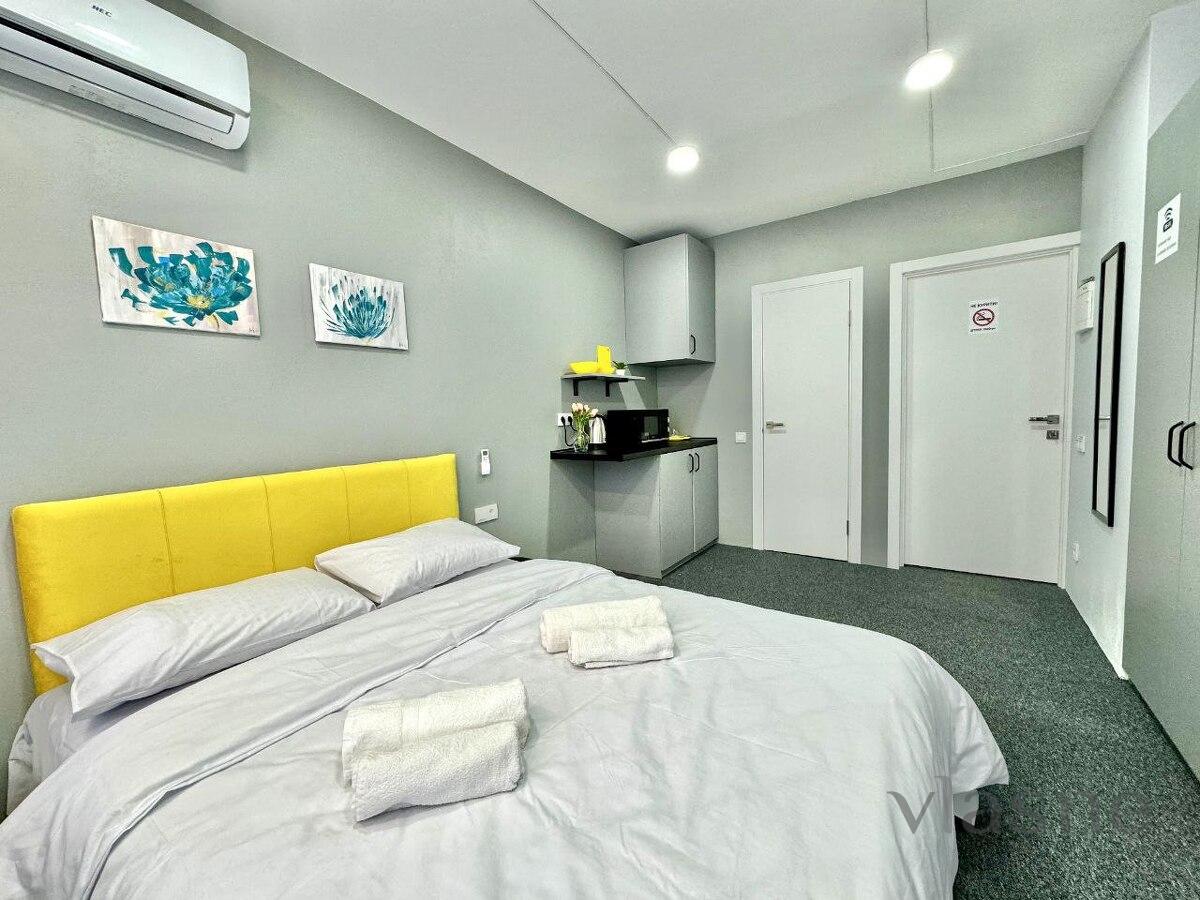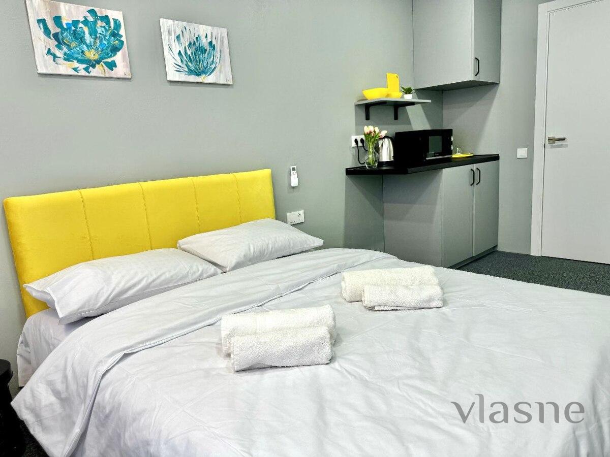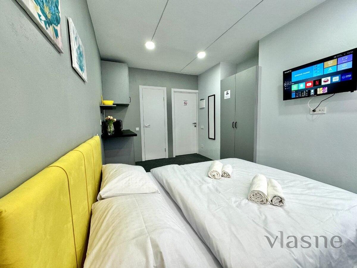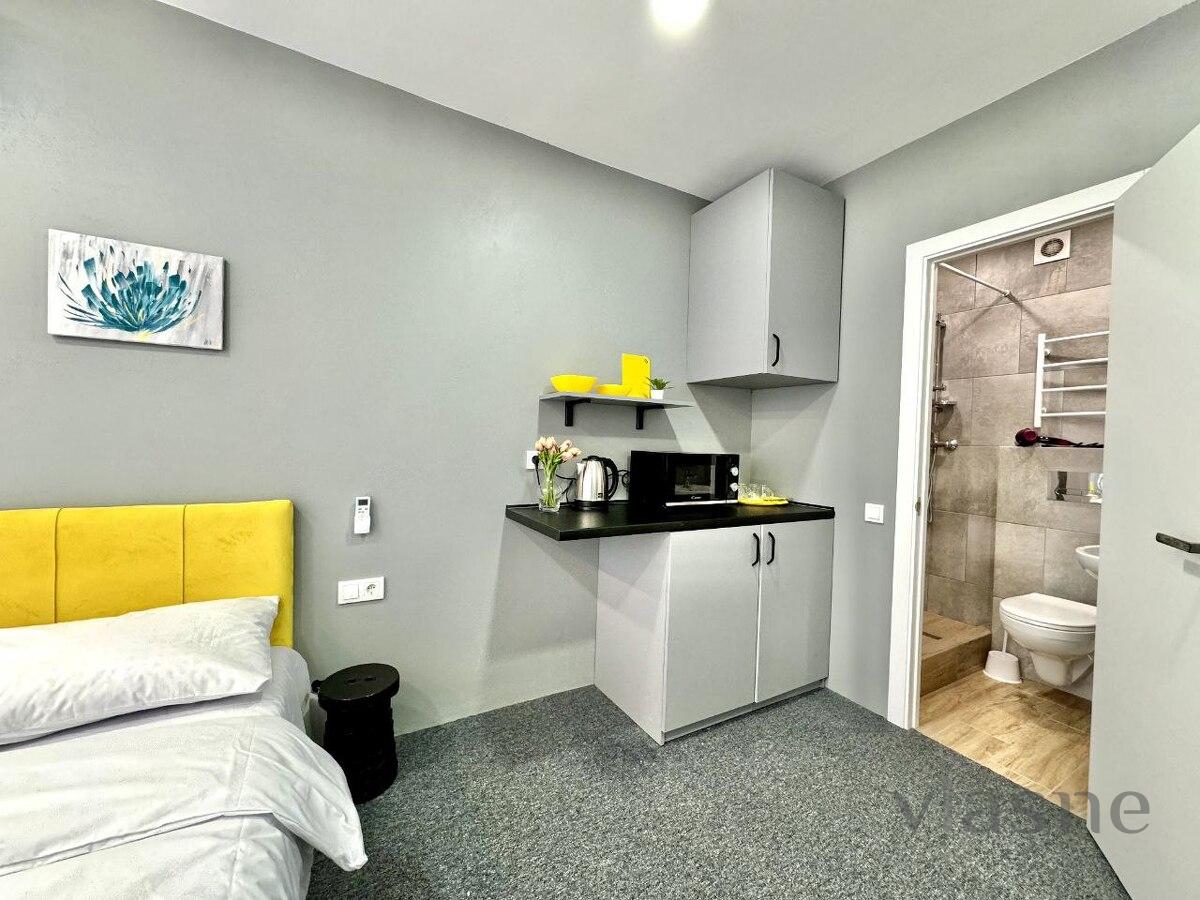 The room has all the necessary furniture for your quiet: a double bed with an orthopedic mattress, a wardrobe for special speeches and a wall-mounted mirror. For your comfortable stay, the apartments also have air conditioning, TV and Wi-Fi. The compact kitchen area has a small surface with a sink, a stove, a refrigerator, a microwave oven, a kettle and the necessary utensils. Sanitary care for shower: sink, boiler and hygiene essentials. Fresh, stylish whiteness and clean towels are always in evidence. Please check the availability of your rental at the weekend using the phone number. Book by phone at any time!