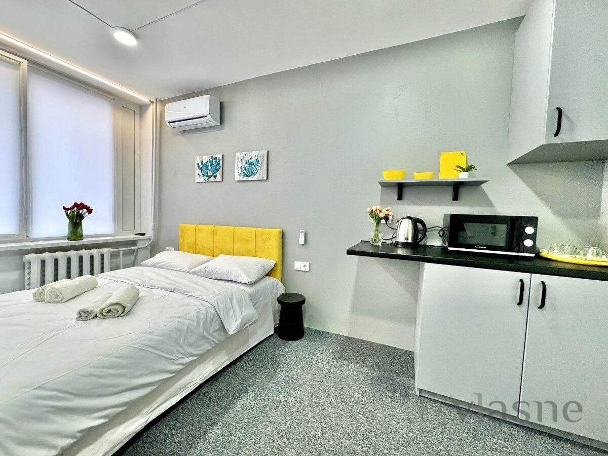 The apartments are located near the Vokzalna metro station (10 minutes on foot) at the address: st. Olesya Gonchara, 96. Nearby are also the expanded shopping center "Ukraine Department Store" and the National Circus of Ukraine, as well as shops, cafes, and restaurants. The one-room apartments are currently undergoing renovation.