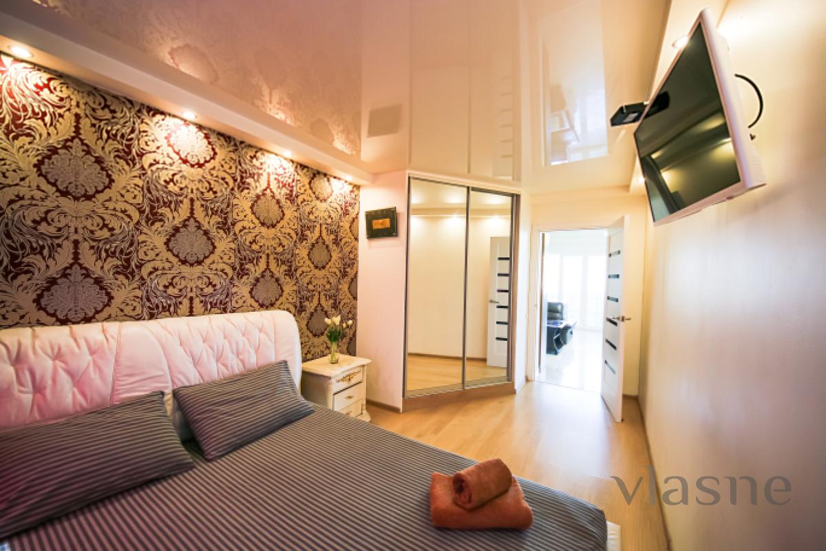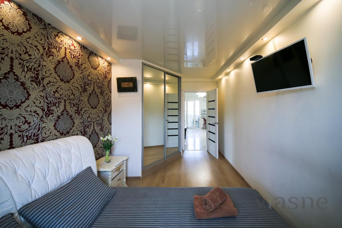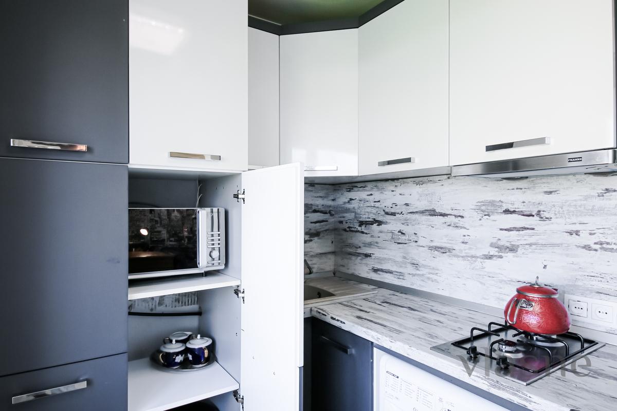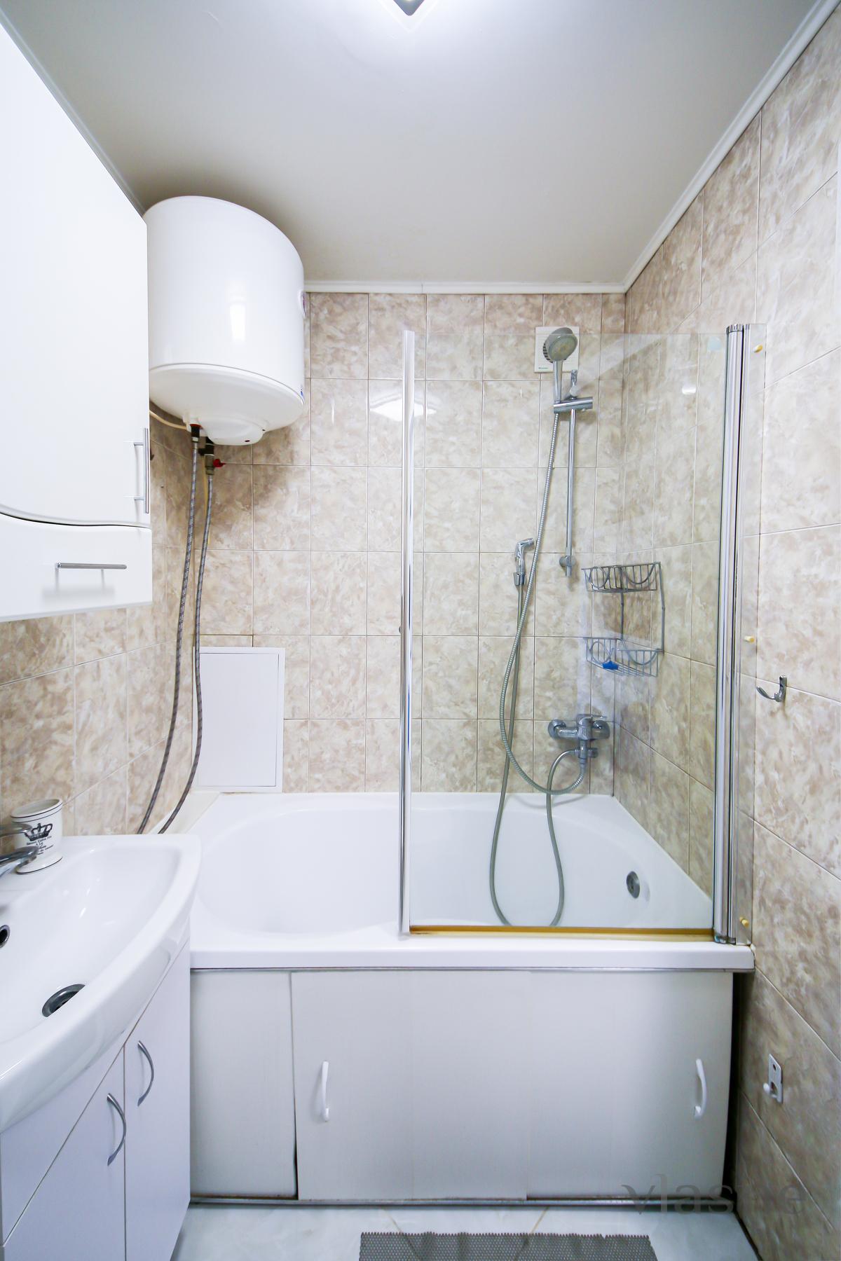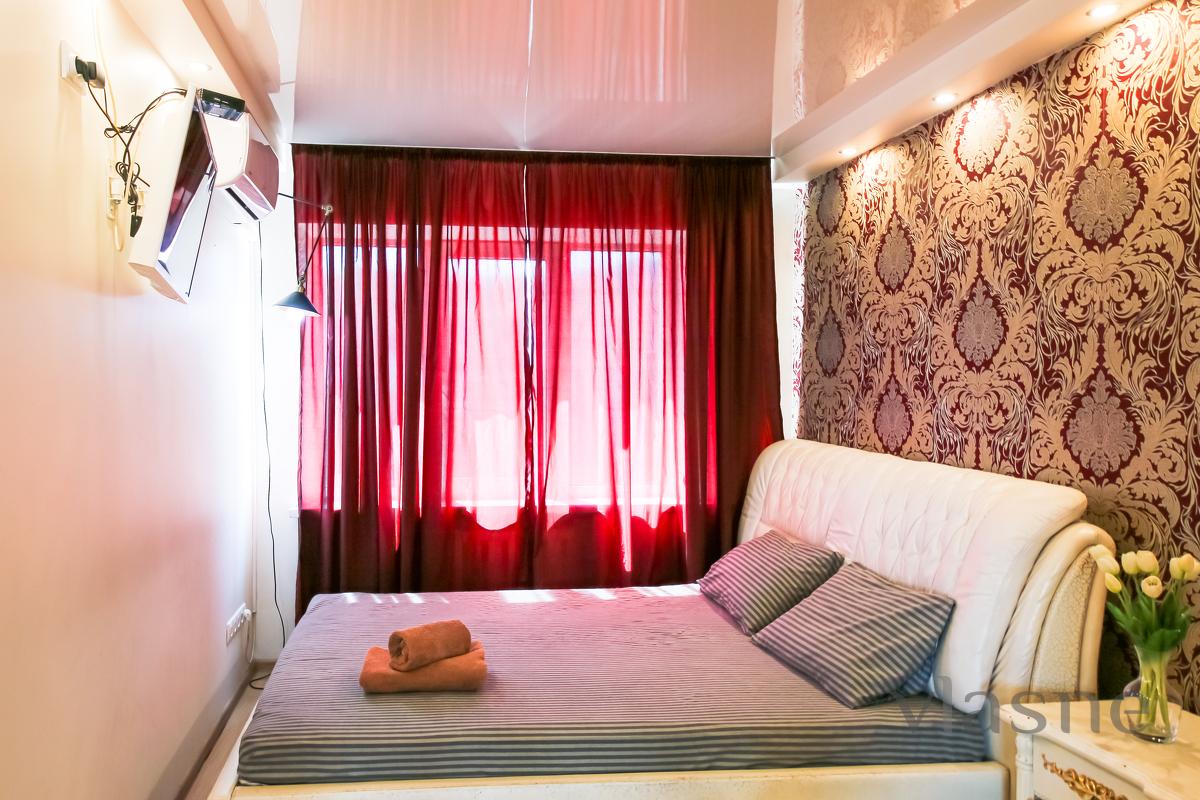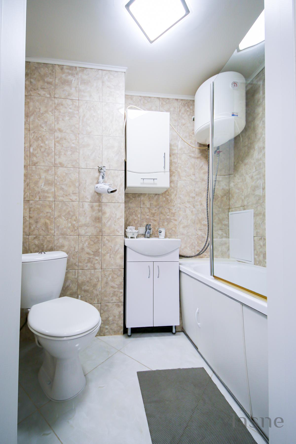 At the entrance to the apartment there is a wardrobe for the upper wardrobe, a bedside table and a chest of drawers with a mirror. The vital studio favors white and cream tones. The space is divided into kitchen and living areas and has access to the balcony. The complete range of furniture is suitable for both work and work: a sofa with a coffee table, a work desk with a side table and a table lamp. The kitchen area has a new furniture set in black and white colors. The kitchen is small, but it has everything necessary for a comfortable stay: a refrigerator, a stove, a range hood, a kettle and dishes with utensils. And it also has a living table with side tables. The bedroom is decorated in a white color with an accent wall and light furniture. For the reception of guests, the following is provided: a double bedroom with an orthopedic mattress, bedside tables, a wardrobe with mirror surfaces. For a comfortable stay, everyday equipment is provided: TV, WI-FI, air conditioner and washing machine. The bathtub is connected to the basin and is painted in a dark cream color. In the middle there are: a bathtub, a washbasin, a toilet, bedside tables and a boiler. Availability of renting an apartment on the weekend - check the phone number!