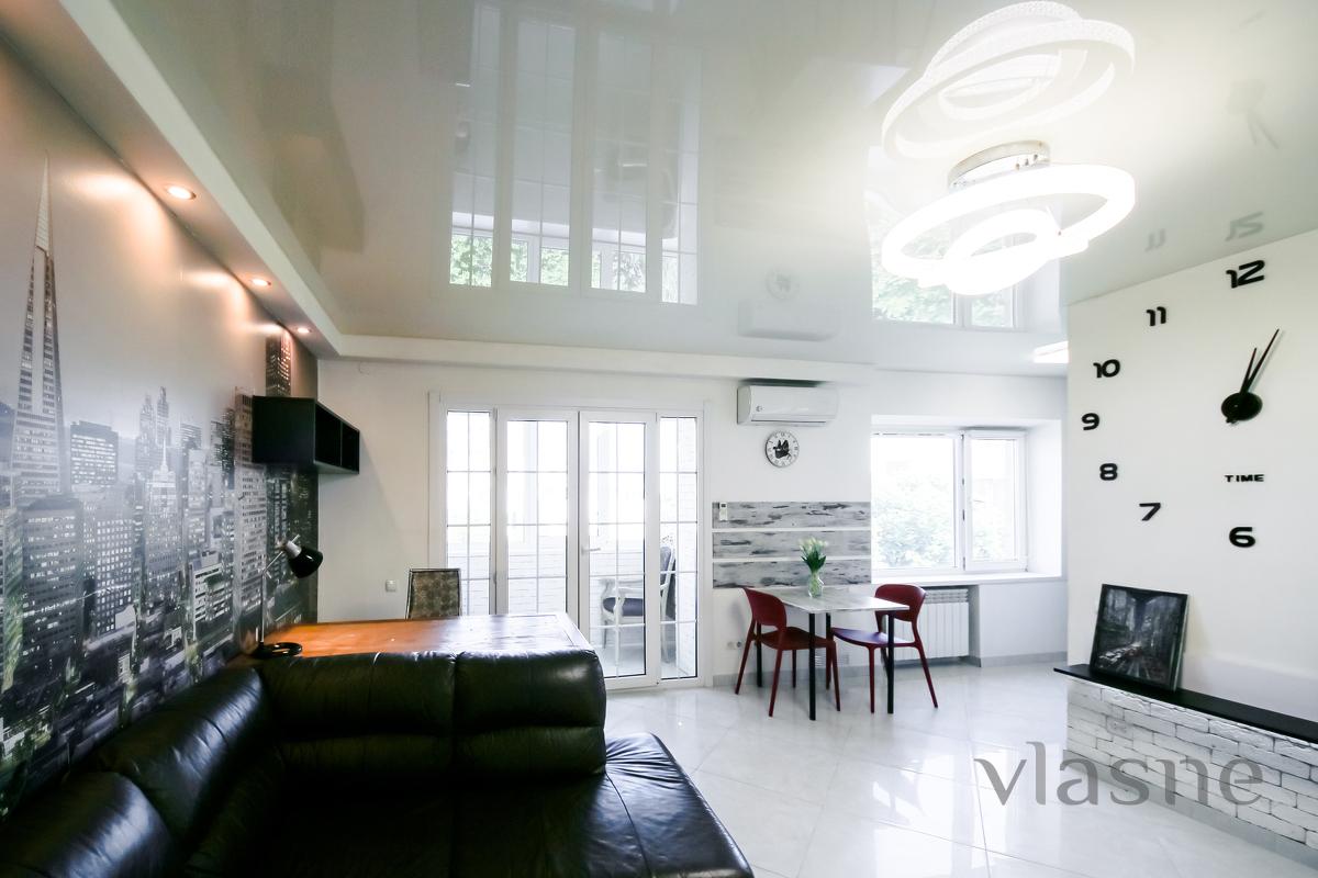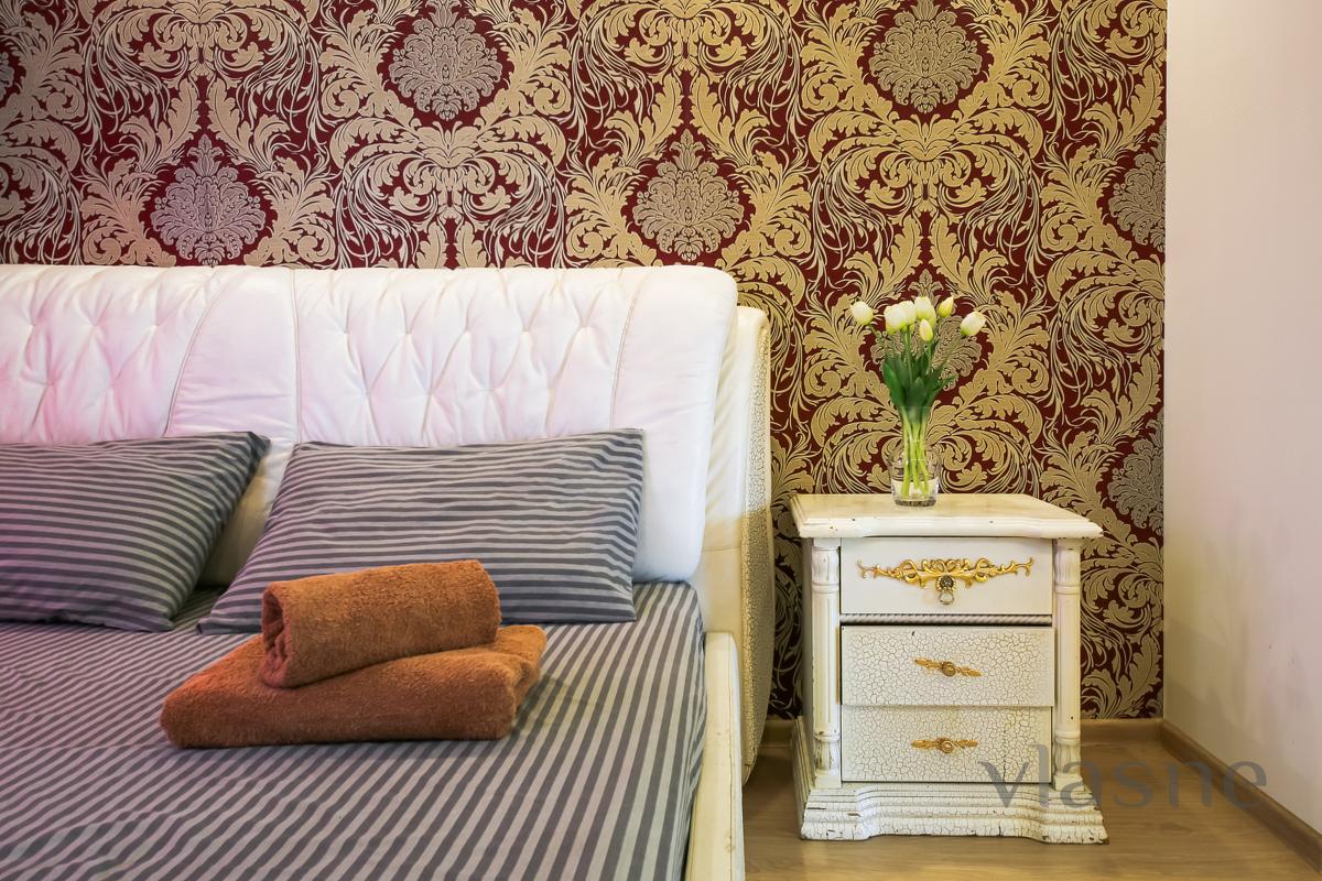 The apartment with 2 rooms is located at the address: Blvd. Lesi Ukrainka 19, 250 meters from Pecherska metro station. Nearby, within walking distance: a supermarket, restaurants, bars, coffee shops, clothing stores, a bookstore, a pet store and a bank. The apartment is bright and quiet, with cream and white colors with black color accents.