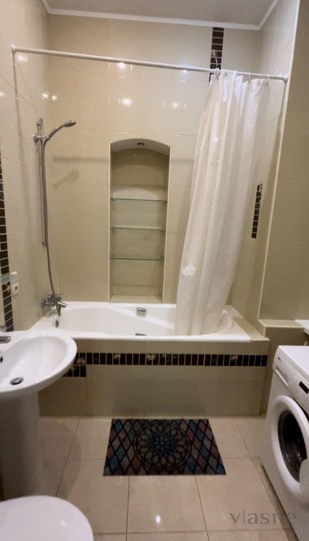 The kitchen is designed in light colors with a brown furniture set. There is a handy living area with a table and chairs. Everyday appliances are necessary for a comfortable stay: refrigerator, electric stove, oven, range hood, electric kettle, microwave oven. First bedroom in Vikon in light colors. In the middle there is all the necessary furniture for a reception area: a double bed with an orthopedic mattress, bedside tables, a wardrobe, an air conditioner, a lamp. The other bedroom has a double bed with an orthopedic mattress, a writing desk. The apartment has air conditioning and WI-FI for a comfortable stay. Є okrema vybiralnya. The bathroom is a bright room, in the middle there is a washbasin, a hanging mirror with a shelf and a washing machine, a bathtub with shelves for your toiletries. Forever you will see clean towels and fresh, stylish whiteness. Availability of renting an apartment on the weekend - check the phone number.