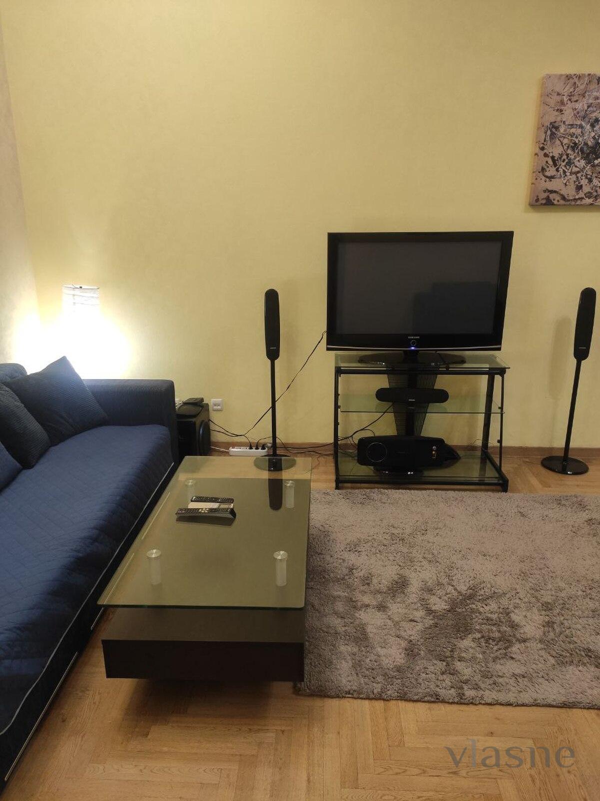The apartment is located at the address: st. Evgena Chikalenka, 21, near the station. m. Teatralna. Restaurants, cafes, cafés, banks and grocery stores are within walking distance. The spacious, bright living room accommodates everything for a comfortable stay. And itself: a large sofa, an armchair, a coffee table and a chest of drawers with a TV.