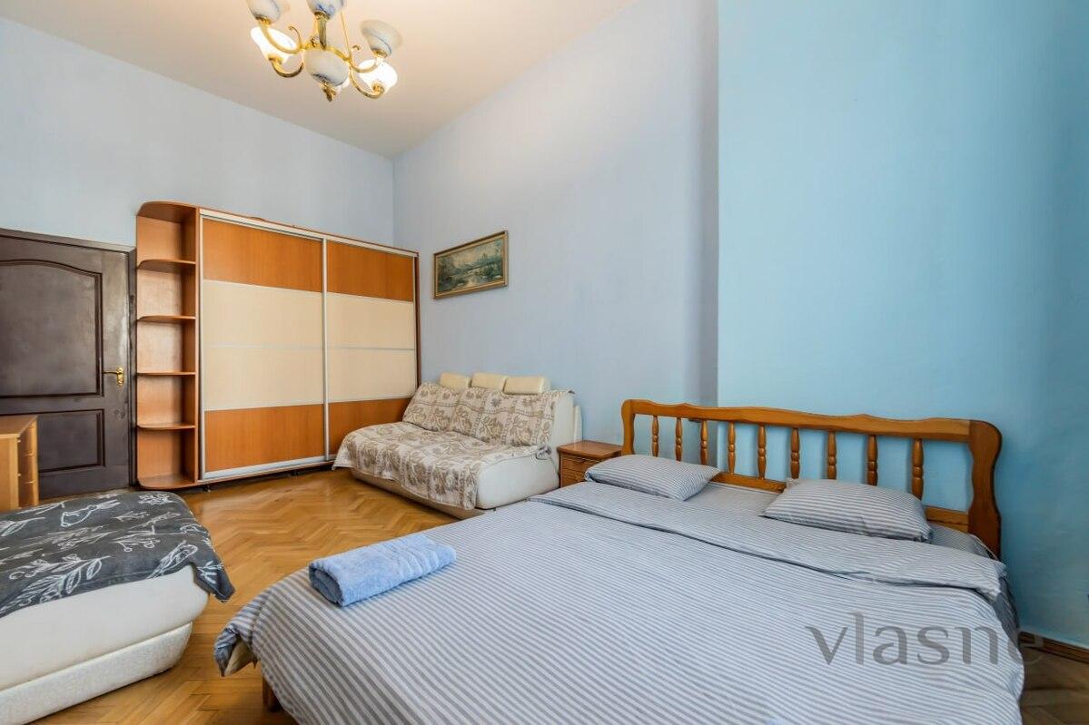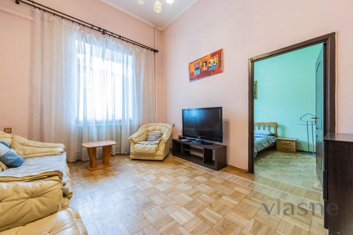 The apartment is located at the address: st. Kostolna, 7, near the station. m. Maidan Nezalezhnosti. Restaurants, cafes, cafés, banks and grocery stores are within walking distance. The living room contains everything for a comfortable stay. And itself: a large sofa, armchairs, a coffee table and a chest of drawers with a TV.