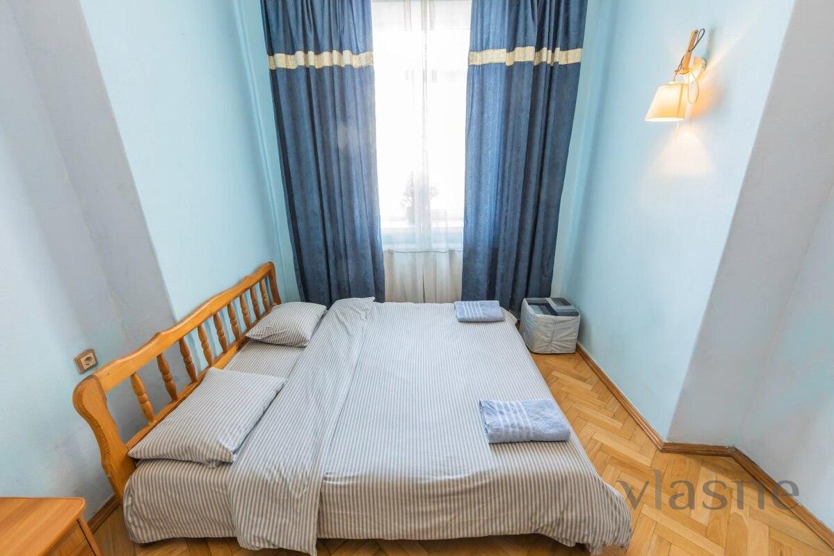 In the kitchen, in addition to the furniture, there is a living area. Everyday appliances are necessary for a comfortable stay: refrigerator, gas stove, oven, range hood, electric kettle, microwave oven. First bedroom in Vikon in light colors. In the middle there is all the necessary furniture for the reception area: a double bed with an orthopedic mattress, bedside tables, a wardrobe, an air conditioner. The other bedroom contains: a double bedroom with an orthopedic mattress, a wardrobe for special speeches and a dressing table. The third bedroom is decorated in soothing colors. All the necessary furniture for a quiet stay has been provided: a double bed with an orthopedic mattress, a wardrobe, an air conditioner. The apartment has air conditioning and WI-FI for a comfortable stay. The washroom is connected to the bathtub, there is a sink in the middle, a hanging mirror with a shelf and a washing machine. Forever you will see clean towels and fresh, stylish whiteness. Availability of renting an apartment on the weekend - check the phone number.