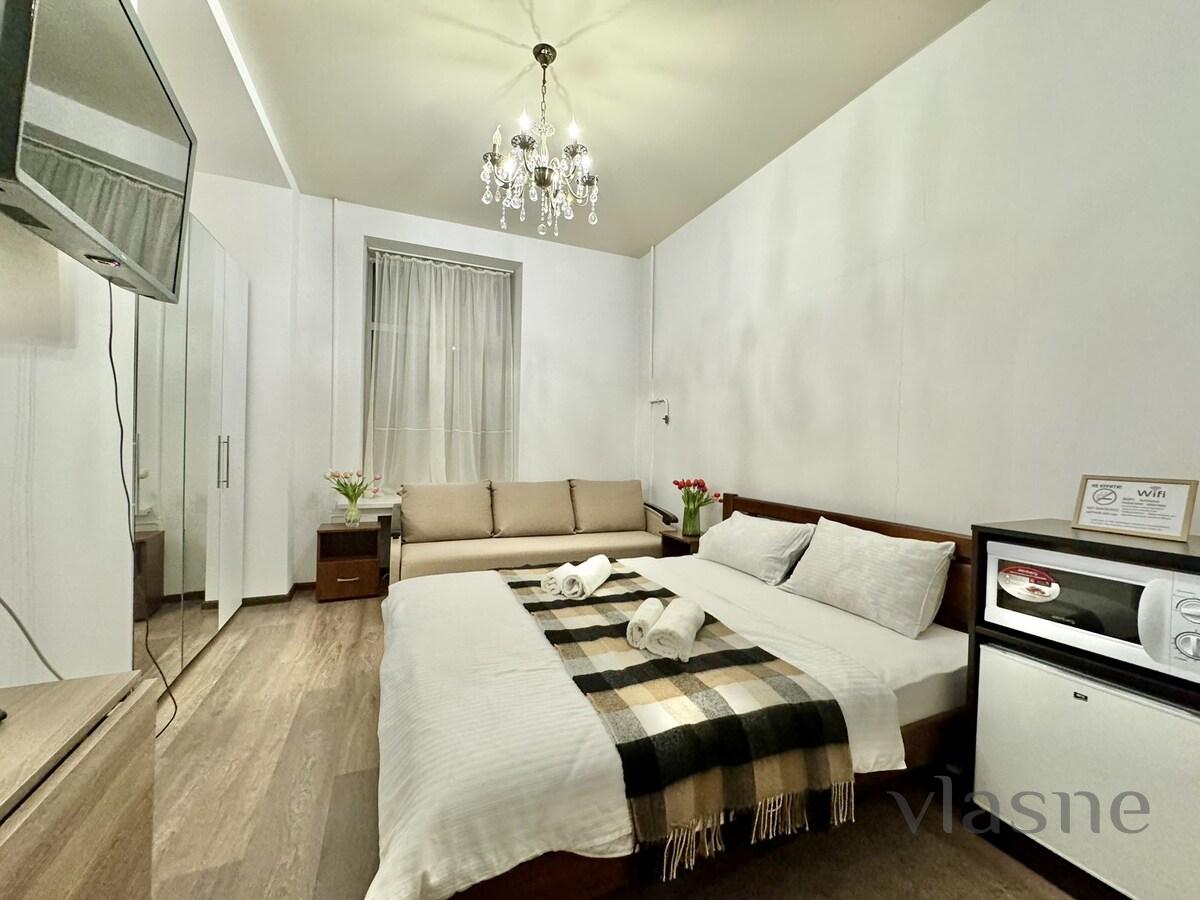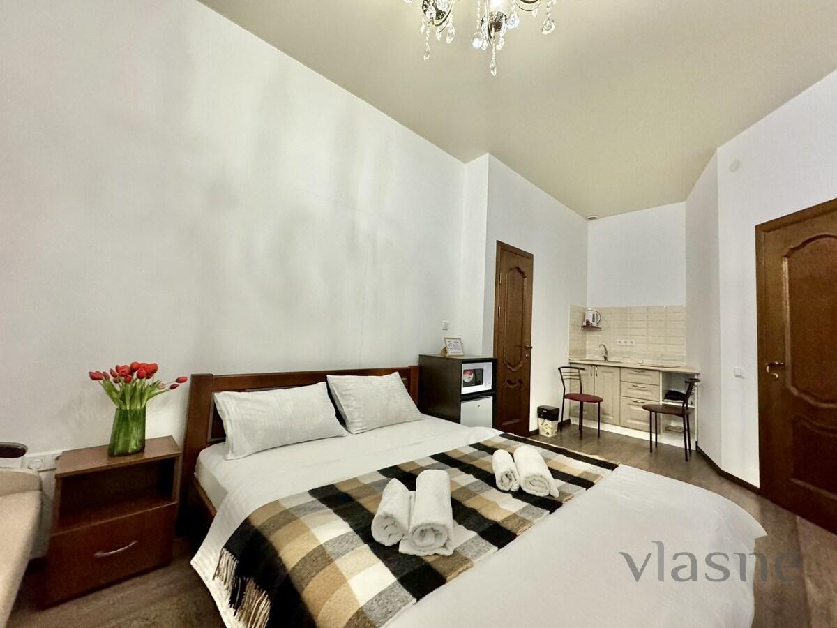 Comfortable apartments are located in the center of Kiev, at the address: st. Antonovicha, 93. The Olimpiyska metro station is nearby. Within walking distance: a number of restaurants, cafes, bars, shops, a pharmacy. A bright studio apartment, decorated with light colors and wooden furniture. The kitchenette area has a work surface and a sink.